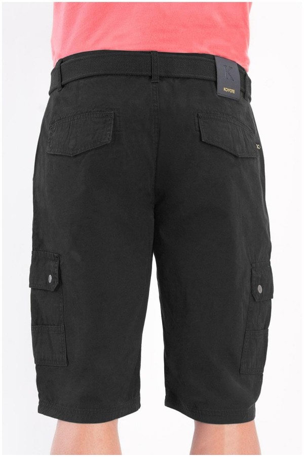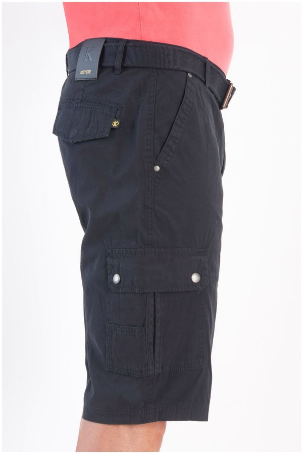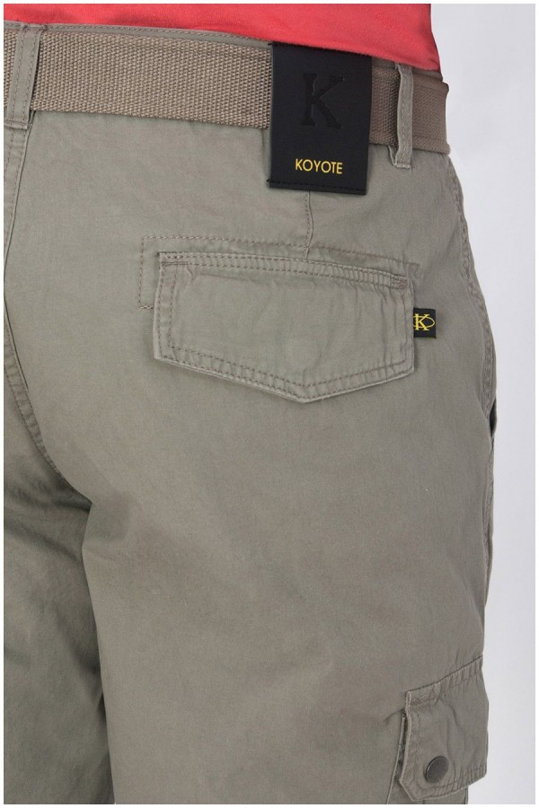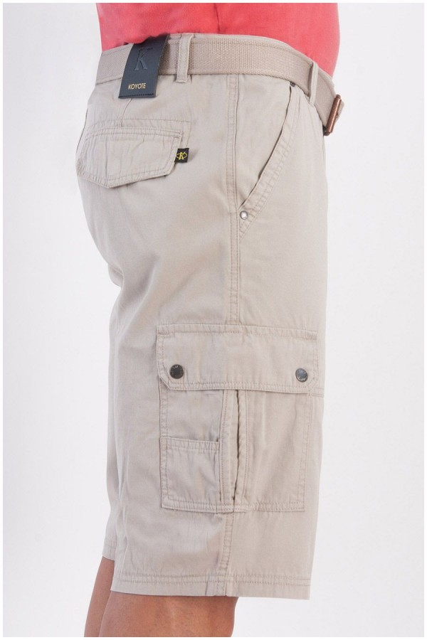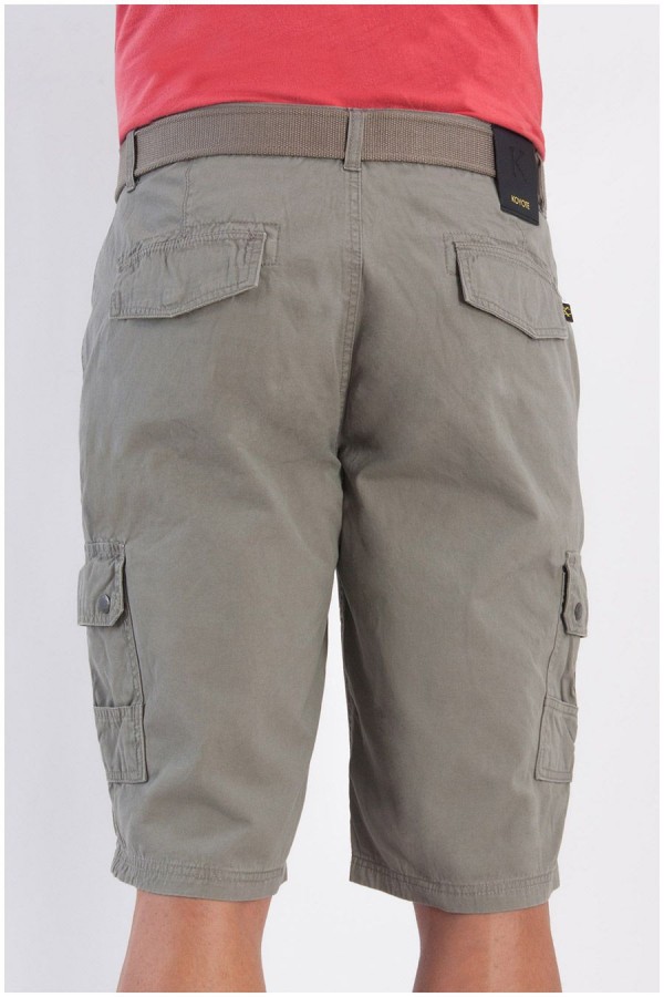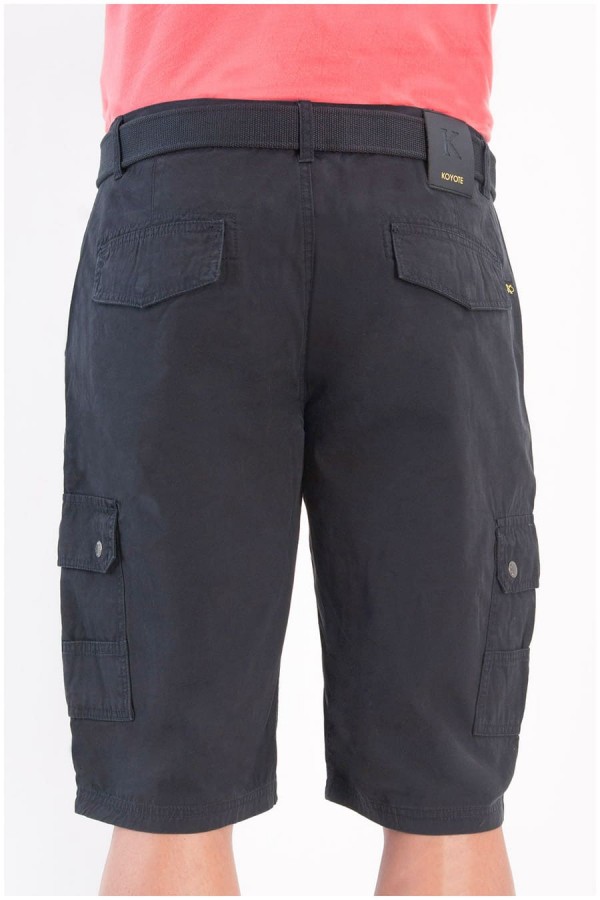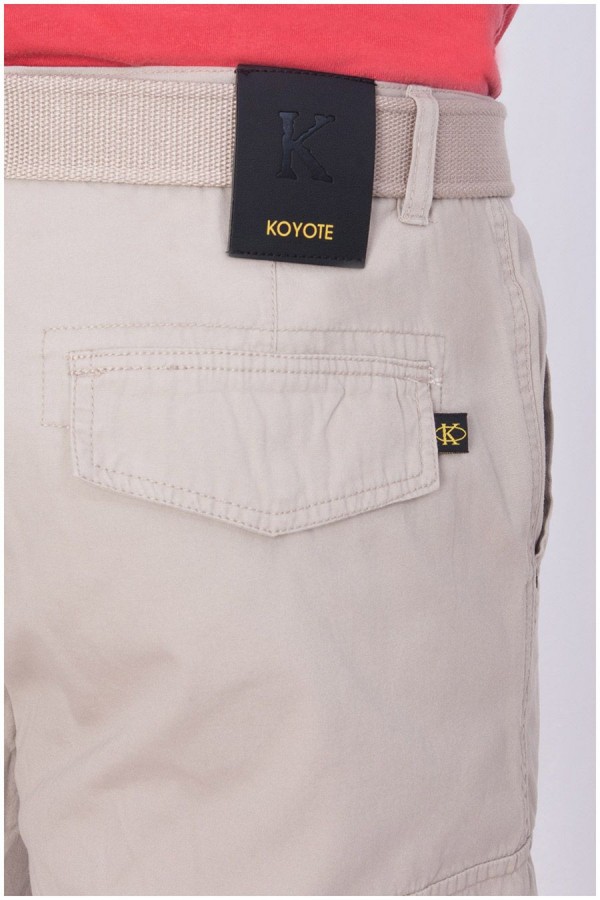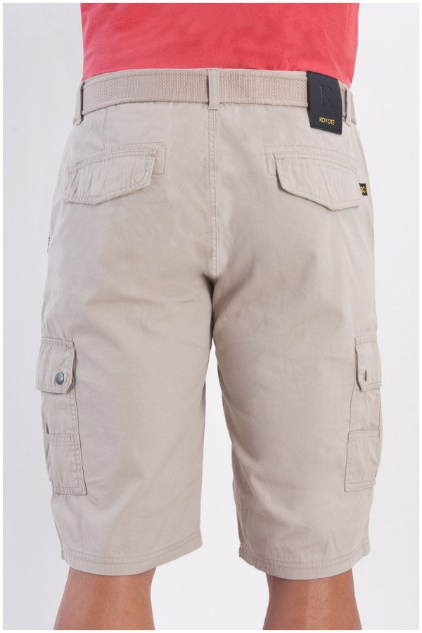 Uni cargo bermuda van Koyote. Deze short, gemaakt van 100% katoen, heeft grote cargozakken met een klep met elk 2 drukknopen op de pijpen. Tevens nog diverse andere zakken op de achterkant en zijkant. Deze korte broek wordt geleverd inclusief bijpassende riem.