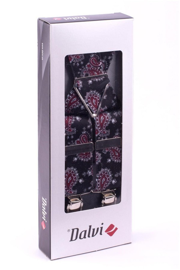 Zwarte bretels met rood patroon van Dalvi, 100% microvezel. De lengte is verstelbaar: one size fits all.
