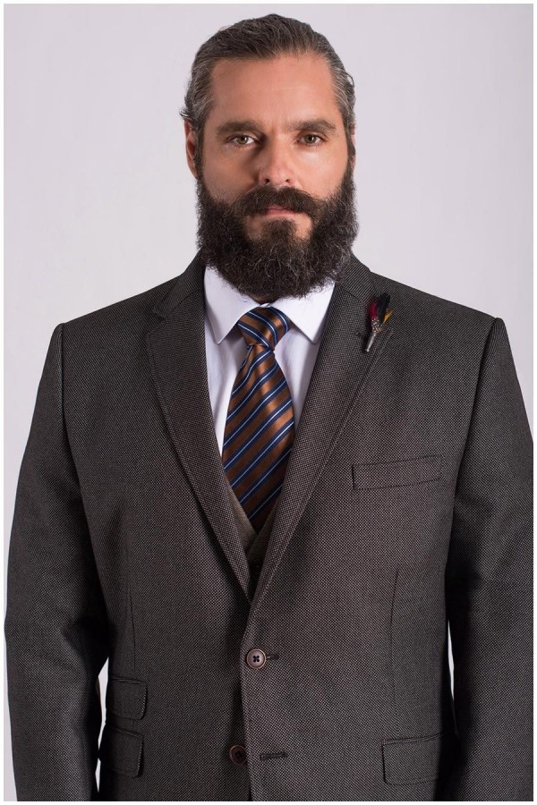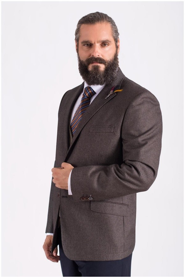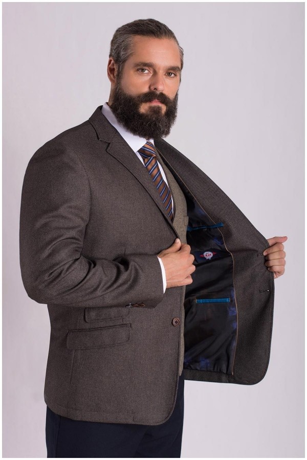 Colbert met enkele rij knoopsluiting (single breasted) van Plus Man. Sluiting met 2 knopen boven elkaar. Het jasje heeft vele zeer modieuze details zoals een kraag met contraststof, een dubbele klepzak aan de rechterkant, en diverse binnenzakken.