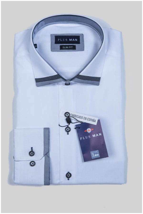 Unikleurig lange mouw dress overhemd van Plus Man. Dit shirt is gemaakt van een zeer mooie fil-a-fil kwaliteit van katoen en polyester, ideaal voor onder een kostuum of colbert, maar ook prima in de vrijetijd te dragen. In de wide spread kraag is zijn 2 verschillende contraststoffen verwerkt, waarvan er een ook terugkomt aan het uiteinde van de manchetten en bij de knopen. De manchet heeft 2 knopen en is daarmee gemakkelijk te verstellen.