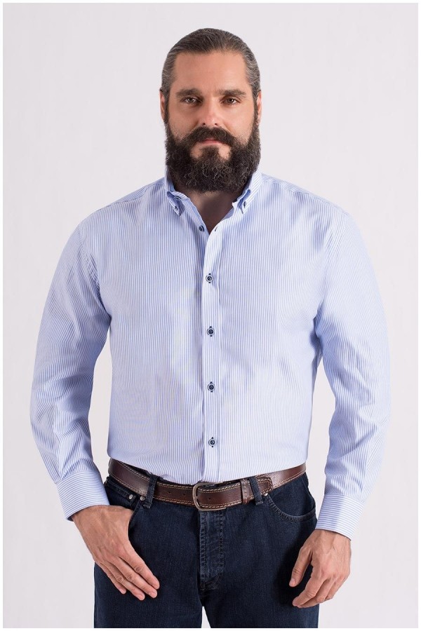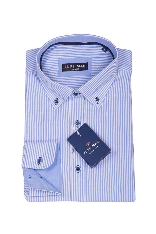 Een echte klassieker, dit gestreepte lange mouw overhemd met extra lange mouwen! Dit Plusman overhemd combineert bij elke chino of jeans en is ook als smart casual nog te dragen. Langs de knopenlijst bevindt zich een chambray contraststof, die ook wordt gebruikt aan de binnenkant van de kraag en manchetten. Kraag met button-down.