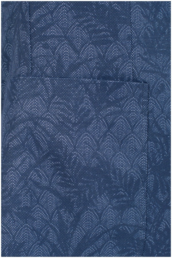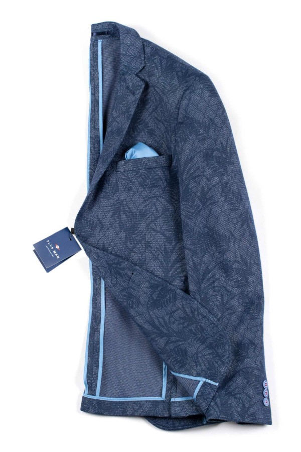 Bedrukte katoenen colbert van het merk Plusman. Het casual jasje is bedrukt met een modieus tonaal motief van bladeren. Het colbert sluit met twee knopen (single breasted) en de manchet heeft drie knopen. Alle knopen zijn voorzien van een subtiel rood stikseldetail. De blazer heeft twee zakken, een borstzak links en een binnenzak. De meegeleverde pochet is gemaakt van dezelfde stof als de contrasten aan de binnenkant van het colbert. De lichtblauwe kleur van deze stof combineert mooi met de contraststof in de kraag als extra detail. Dit colbert is tevens verkrijgbaar in een ander vergelijkbaar model (art. 110174).