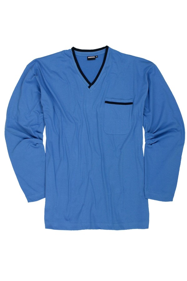 Uni lange pyjama van Adamo (Art.nr. Beppo). De grote maten pyjama bestaat uit een uni pyjamahemd met v-hals en een borstzakje en een uni pyjamabroek met elastische band en een achterzakje. De pyjamajas heeft contrastbanden langs de kraag en aan de het borstzakje. De XXL pyjamaset is gemaakt van 100% katoen in een fijne, zachte en huidvriendelijke jerseykwaliteit. De pyjama kan worden gewassen op 60 graden in de wasmachine.