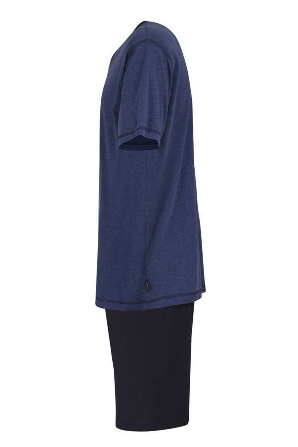 Uni korte pyjama van het merk Ceceba. De grote maten shortama bestaat uit een effen korte mouw pyjamahemd met melange-optiek en een moderne v-hals die in een contrastkleur is uitgevoerd en een uni korte broek in dezelfde kleur als de contrastaccenten op het pyjamashirt. De short heeft een achterzak.