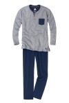 Lange pyjamaset bestaande uit een pyjamahemd met serafinokraag met 3 knoopjes en opgestikt borstzakje in contrastkleur en een uni lange broek. De grote maten pyjama van het merk Ceceba is gemaakt van een zeer zachte easycare katoenkwaliteit uit duurzame productie. Het pyjama-shirt is voorzien van diverse modieuze details zoals contraststiksels, gekleurde banden en printjes.