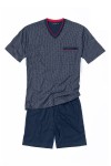 100% katoenen jersey pyjama van Götzburg bestaande uit een korte mouw met blokjes bedrukt pyjamahemd met v-hals en een effen korte broek. Op de borst heeft deze pyjama een klein zakje met een tonale borduur daarop.