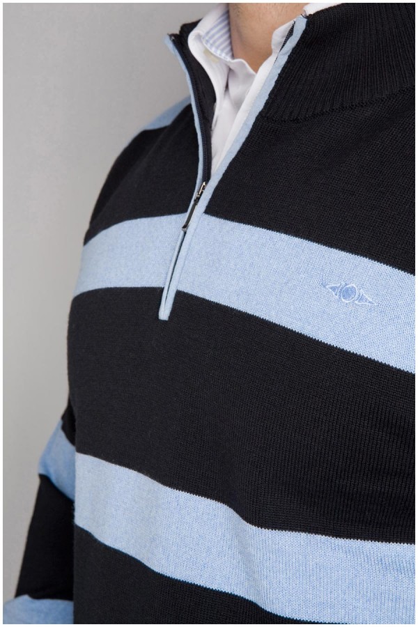 Wollen trui van het merk Plusman met grote horizontale strepen. Deze grote maten pullover is voorzien van een kraag met een ritsopening en heeft een subtiel, tonaal merkborduur op de linker borst. Deze XXL trui is gemaakt van wolmix bestaande uit 50% Australisch wol en 50% polyester.