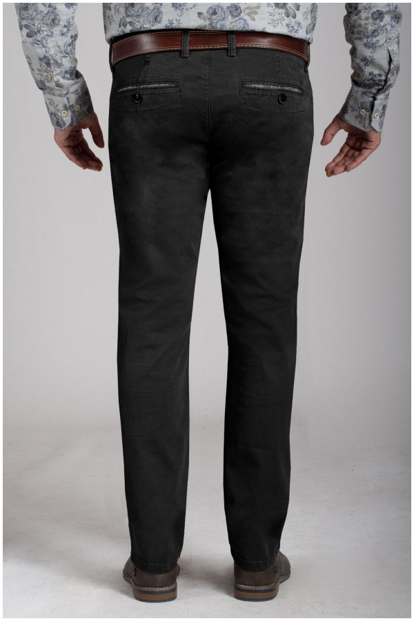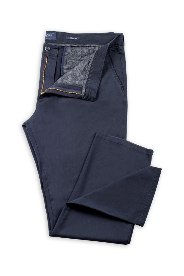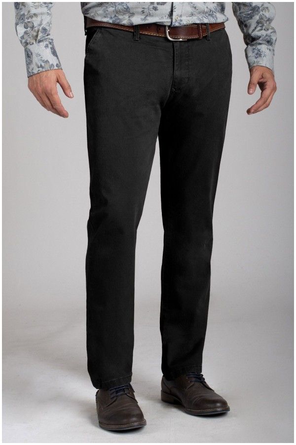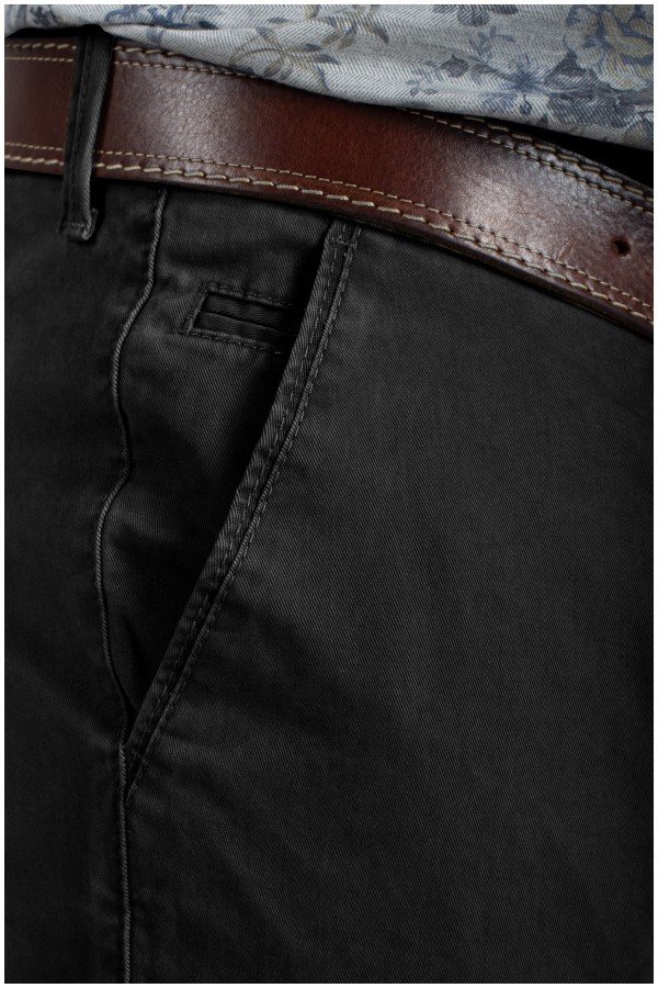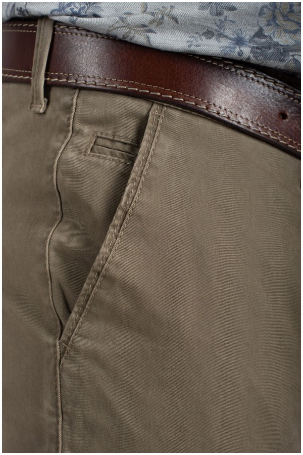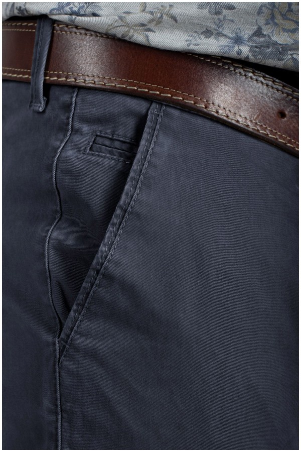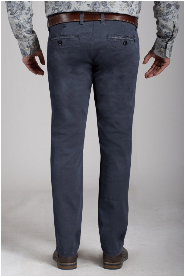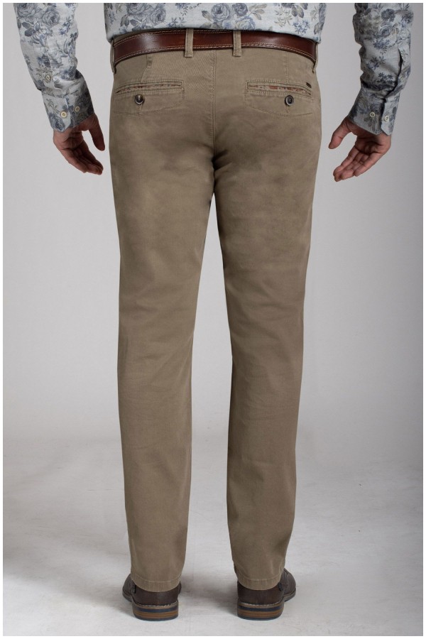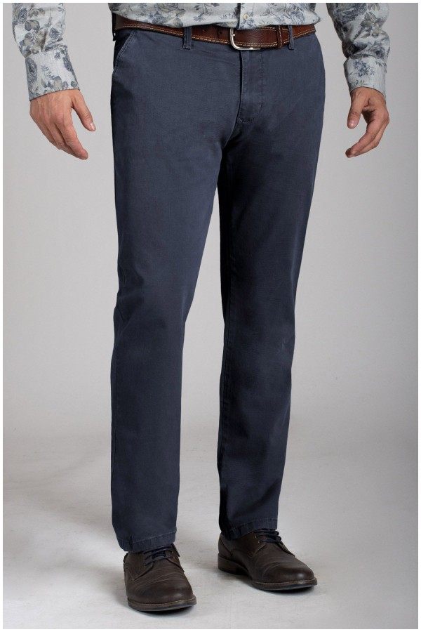 Elastische chino van het merk Pionier (Model Robert). Deze grote maten vrijetijdsbroek, zonder bandplooi, is gemaakt van een zeer hoogwaardige katoen met 2% elastaan erin waardoor de broek uiterst soepel en zacht aanvoelt en dus zeer comfortabel draagt. Klein muntenzakje aan de rechterkant.