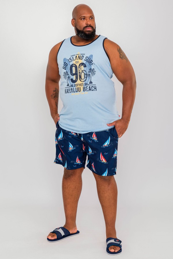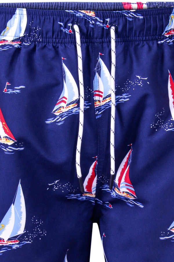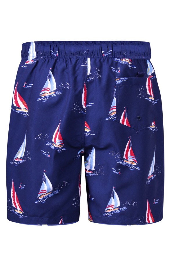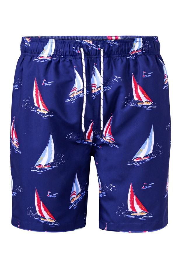 Zwembroek van het merk D555. De grote maten zwemshort (D555 art. nr. 210902 Apollo) is gemaakt van sneldrogend polyester en heeft een Mesh binnenbroek. De xxl swimshort heeft een zomerse print van zeilboten in diverse kleuren en is voorzien van een handig zakje met klittenband op de achterkant. De elastische tailleband is voorzien van koordjes in een contrastkleur.