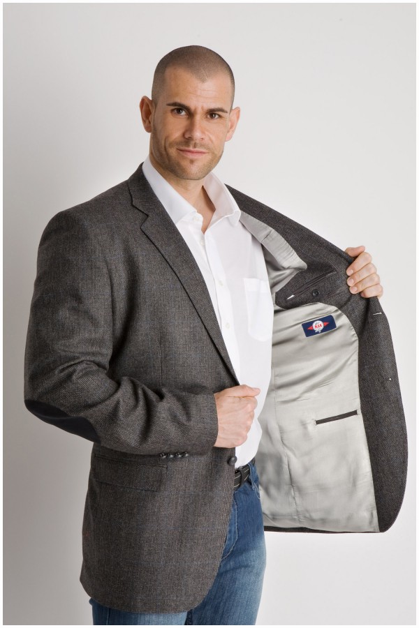 Wollen lengtematen colbert van Plusman met contrastpanelen aan de ellebogen.