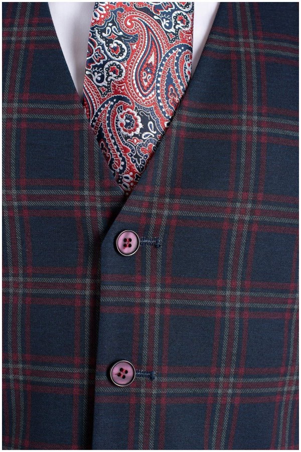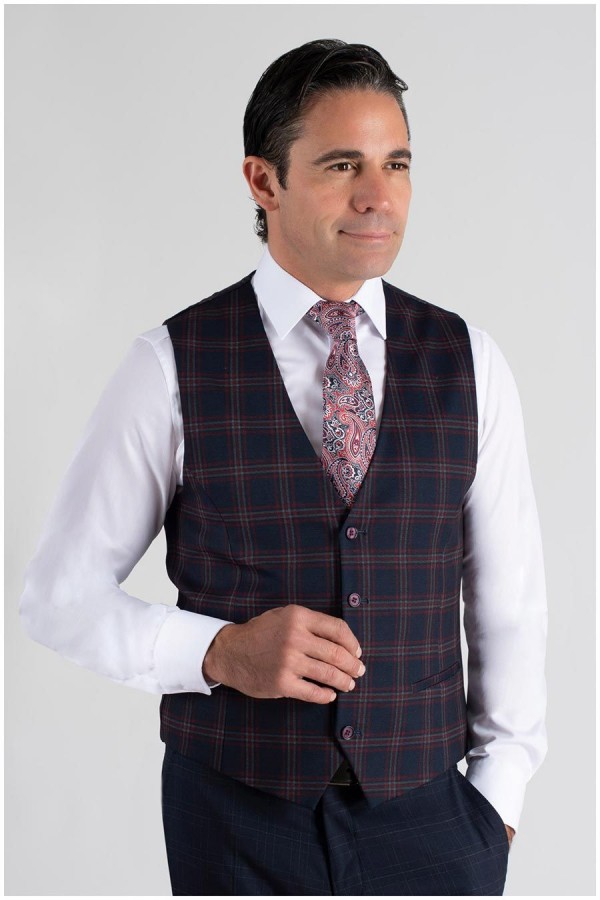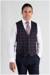 Elastisch gilet van het merk Plusman met bedrukt ruitenpatroon. Het vestje heeft een sluiting met een enkele rij van 4 bijkleurende knopen. Het model combineert dit grote maten gilet met stropdas 109444.