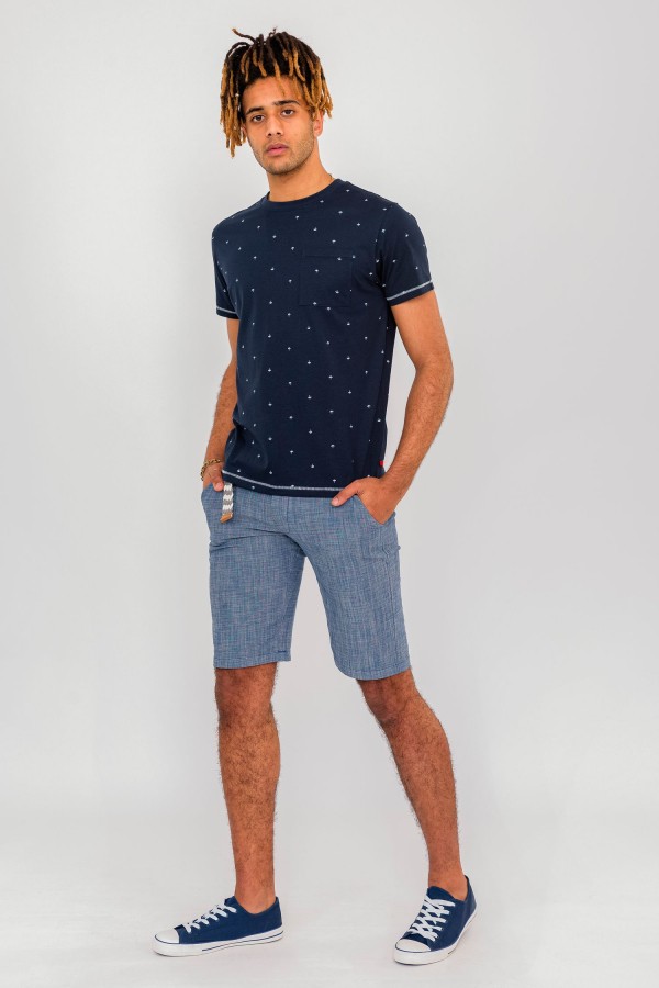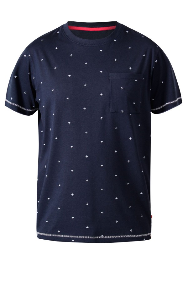 Korte mouw t-shirt van het merk D555, dat gemaakt is van 100% biologisch katoen. Het duurzame t-shirt (D555 art. nr. Forbes 600941) heeft een subtiele print van kleine paraplu's in een contrastkleur en is afgewerkt met diverse modieuze details. Zo is het XXL t-shirt links op de borst voorzien van een borstzakje. Daarnaast is het t-shirt afgewerkt met contrastkleurige stiksels die het t-shirt een sportieve look geven.